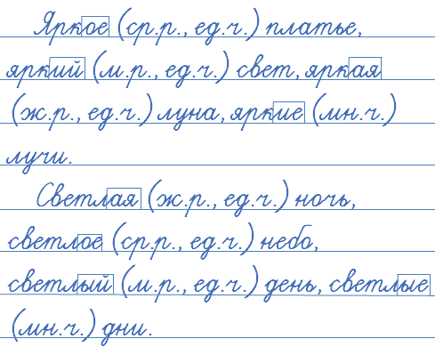 Яркое (ср.р., ед.ч.) платье, яркий (м.р., ед.ч.) свет, яркая (ж.р., ед.ч.) луна, яркие (мн.ч.) лучи.