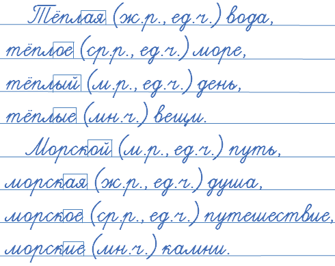 Тёплая (ж.р., ед.ч.) вода, тёплое (ср.р., ед.ч.) море, тёплый (м.р., ед.ч.) день, тёплые (мн.ч.) вещи.