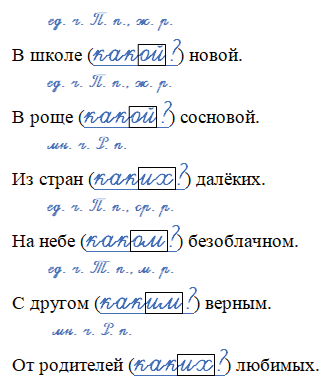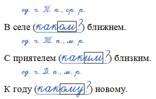 В школе (____) новой. В роще (____) сосновой. Из стран (____) далёких. На небе (____) безоблачном. С другом (____) верным. От родителей (____) любимых. В селе (____) ближнем. С приятелем ( ____) близким. К году (____) новому.
