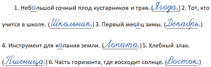 1. Неб_льшой сочный плод кустарников и трав. (___.) 2. Тот, кто учится в школе. (___.) 3. Первый мес_ц зимы. (___.) 4. Инструмент для к_пания земли. (___.) 5. Хлебный злак. (___.) 6. Часть горизонта, где восходит солнце. (___.)