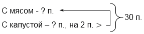 68. Бабушка испекла 30 пирожков с мясом и капустой. Сколько было пирожков с капустой, если их на 2 пирожка больше, чем с мясом?