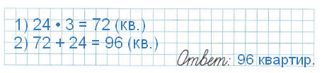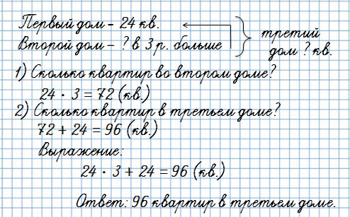 67. В первом доме 24 квартиры, во втором — в 3 раза больше, чем в первом, а в третьем — столько квартир, сколько в первом и втором домах вместе. Сколько квартир в третьем доме?