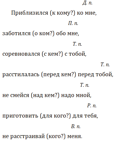 Пр..близился (к кому?), з..ботился (о ком?), с..ревновался (с кем?), ра(с, сс)тилалась (перед кем?), (не)смейся (над кем?), пр..готовить (для кого?), (не)ра(с, сс)траивай (кого?).