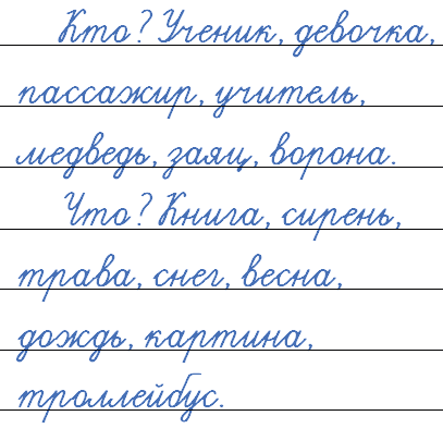 Прочитайте имена существительные. Распределите их по вопросам кто? и что? Запишите их по образцу.