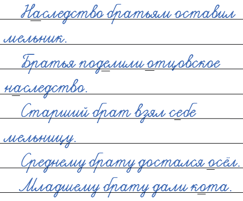 Подберём проверочные слова: поделили - де́лит; отцовское - о́тче; осёл - о́слик; кота - ко́т, горевал - го́ре, плохое - пло́хо. Правописание слов наследство и себе следует запомнить.