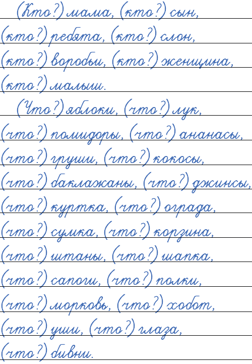 По очереди показывайте друг другу на один из предметов, изображённых на рисунке, и записывайте название с вопросом кто? или с вопросом что? Выигрывает та пара, которая запишет больше имён существительных.
