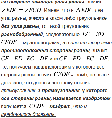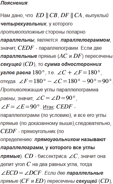 В прямоугольном треугольнике проведена биссектриса прямого угла. Через точку пересечения этой биссектрисы с гипотенузой проведены прямые, параллельные катетам. Докажите, что полученный четырёхугольник - квадрат.