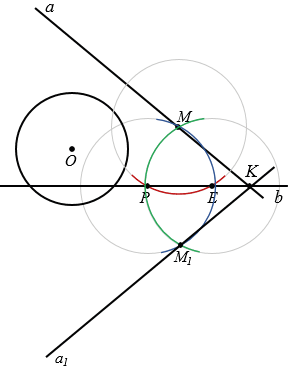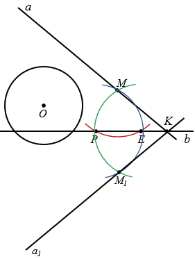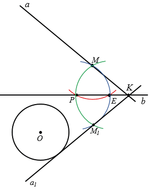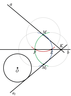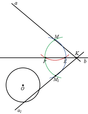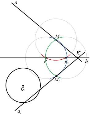 и построим точку М1, симметричную ей относительно b. Для этого строим с помощью циркуля окружность с центром М так, чтобы она пересекла прямую b в двух точках, обозначим их Р и Е (полностью окружность строить необязательно, смотри выделенное красным цветом). Далее строим две окружности с центрами в точках Р и Е так, чтобы каждая из них проходила через точку М (полностью окружности строить необязательно, смотри выделенное синим и зеленым цветом). Эти окружности пересекутся в двух точках, одна из них точка М, а друга точка М1, которая и будет симметрична точке М относительно b. Через точки К и М1 проводим прямую
