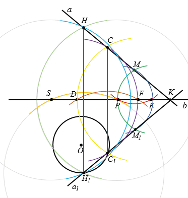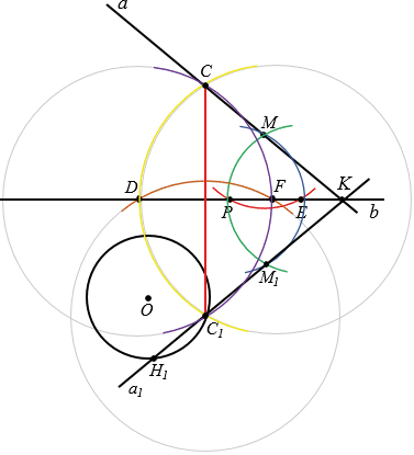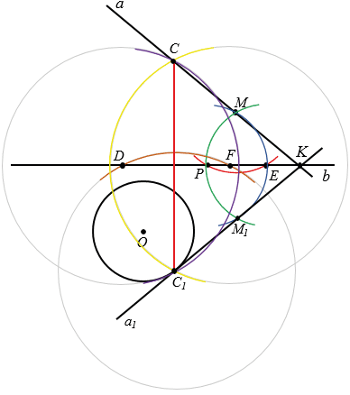 Сначала построим точку С, симметричную точке С1, для этого строим с помощью циркуля окружность с центром С1 так, чтобы она пересекла прямую b в двух точках, обозначим их D и F (полностью окружность строить необязательно, смотри выделенное коричневым цветом). Далее строим две окружности с центрами в точках D и F так, чтобы каждая из них проходила через точку C1 (полностью окружности строить необязательно, смотри выделенное фиолетовым и желтым цветом). Эти окружности пересекутся в двух точках, одна из них точка C1, а другая - точка C, которая и будет симметрична точке C1 относительно b. Соединяем точки C и C1 и получаем отрезок CC1, у которого концы лежат соответственно на прямой