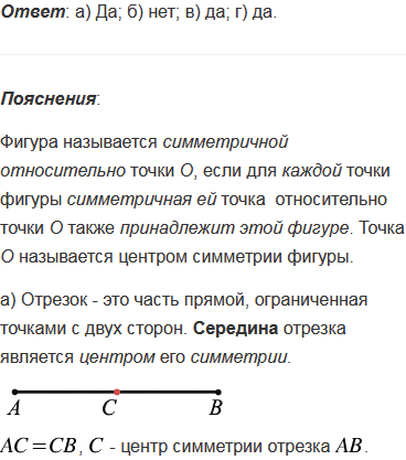 Имеют ли центр симметрии: а) отрезок; б) луч; в) пара пересекающихся прямых; г) квадрат?