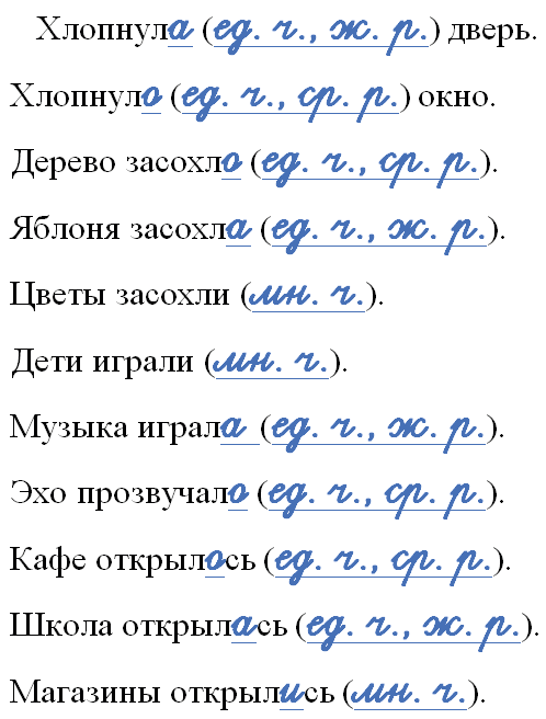 Хлопнул_ (______) дверь. Хлопнул_ (______) окно. Дерево засохл_ (______). Яблоня засохл_ (______). Цветы засохл_ (______). Дети играл_ (______). Музыка играл_ (______). Эхо прозвучал_ (______). Кафе открыл_сь (______). Школа открыл_сь (______). Магазины открыл_сь (______).