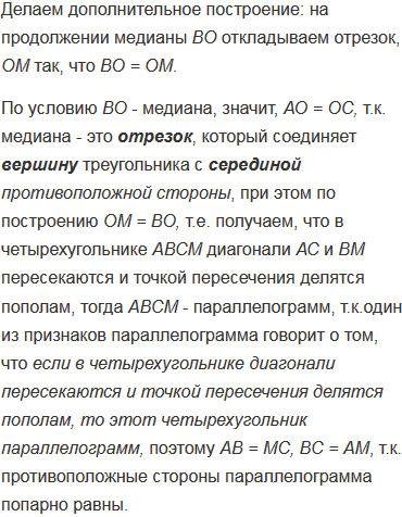 На двух сторонах треугольника вне его построены квадраты. Докажите, что отрезок, соединяющий концы сторон квадратов, выходящих из одной вершины треугольника, в два раза больше медианы треугольника, выходящей из той же вершины.