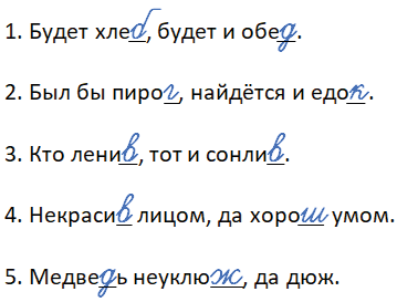 1. Будет хле_, будет и обе_. 2. Был бы пиро_, найдётся и едо_. 3. Кто лени_, тот и сонли_. 4. Некраси_ лицом, да хоро_ умом. 5. Медве_ь неуклю_, да дюж.
