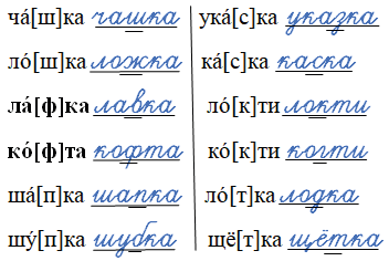 Чашка (чашечка), ложка (ложечка), лавка (лавочка), кофта (словарное слово), шапка (шапочка), шубка (шуба), указка (указать), каска (касок), локти (локоток), когти (коготь), лодка (лодочка), щётка (щёточка).