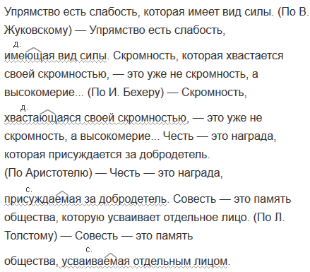 1. Упрямство есть слабость, которая имеет вид силы. (По В. Жуковскому) 2. Скромность, которая хвастается своей скромностью, — это уже не скромность, а высокомерие... (По И. Бехеру) 3. Честь — это награда, которая присуждается за добродетель. (По Аристотелю) 4. Совесть — это память общества, которую усваивает отдельное лицо. (По Л. Толстому)