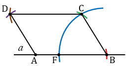 Теперь строим две окружности с центрами в точках А и С радиусами КN и МЕ соответственно (полностью окружности строить необязательно, смотри выделенное фиолетовым и коричневым цветом). Точку пересечения данных окружностей обозначаем буквой D. Соединяем точки А и D, С и D, получаем четырехугольник АВСD.