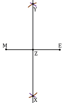 Затем находим середину отрезка ME. Для этого строим окружности радиуса ME с центрами в точках M и E (полностью окружности строить необязательно, смотри выделенное фиолетовым и коричневым цветом). Точки пересечения данных окружностей обозначаем буквами Y и X. Проводим прямую через точки Y и X, точку пересечения прямой YX с отрезком МЕ обозначаем буквой Z.