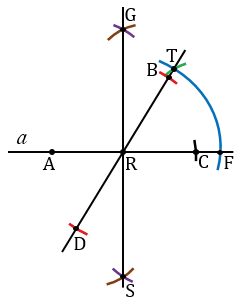 Затем находим середину отрезка АС. Для этого строим окружности радиуса АС с центрами в точках А и С (полностью окружности строить необязательно, смотри выделенное фиолетовым и коричневым цветом). Точки пересечения данных окружностей обозначаем буквами G и S. Проводим прямую через точки G и S, точку пересечения прямой GS с прямой