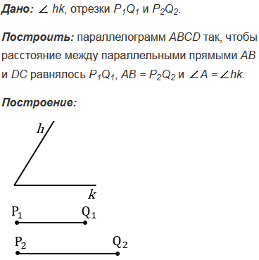 Даны острый угол hk и два отрезка Р1Q1 и Р2Q2. Постройте параллелограмм АВСD так, чтобы расстояние между параллельными прямыми АВ и DC равнялось Р1Q1, АВ = P2Q2 и
