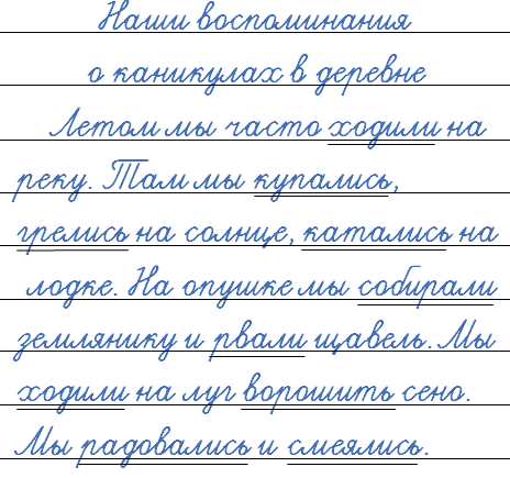 Летом я часто ходил на реку. Там я купался, грелся на солнце, катался на лодке. На опушке я собирал землянику и рвал щавель. Я ходил на луг ворошить сено. Я радовался и смеялся.