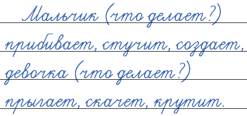 Держать, стучать, пилить, мастерить, встречать; играет, прыгает, радуется, смешит.