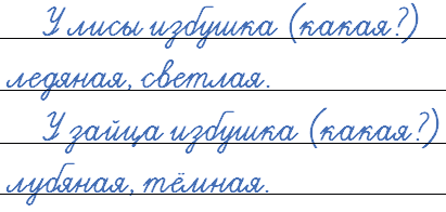 Прочитайте начало сказки. Вспомните её название. Какие слова описывают избушки зайца и лисы? На какой вопрос они отвечают?