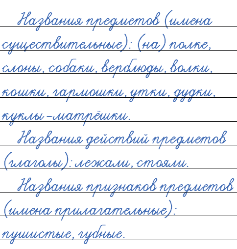 1) слова — названия предметов (имена существительные): (На) полке, слоны, собаки, верблюды, волки, кошки, гармошки, утки, дудки, куклы-матрёшки.