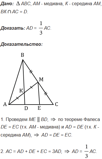 Точка К - средина медианы АМ треугольника АВС. Прямая ВК пересекает сторону АС в точке D. Докажите, что АD =