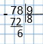 Если трудно вспомнить самое большое число до 78, которое делится без остатка на 9, то частное можно найти методом подбора. Надо 78 разделить на 9. Пробуем, например, в частном число 6. Проверим: если 9 умножить на 6 получим 54. Найдём остаток и сравним его с делителем: 78 - 54 = 24, 24 значительно больше 9. Тогда попробуем в частном 8. Если 9 умножим на 8 получим 72. 78 - 72 = 6, 6 < 9, значит частное подобрали верно, оно равно 8, а остаток 6.