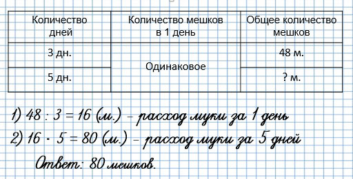 3. В пекарне за 3 дня израсходовали 48 мешков муки. (Ежедневный расход муки один и тот же.) На сколько дней хватит 80 мешков муки, если ежедневный расход муки не изменится?