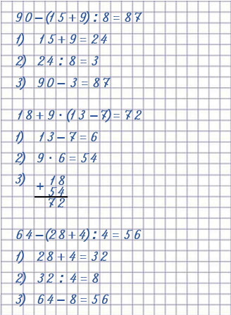 18 + 9 • (13 - 7) = 18 + 9 • 6 = 18 + 54 = 72 |