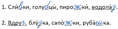 2. Вдру_, блу́_ка, сапо́_ки, руба́_ка.