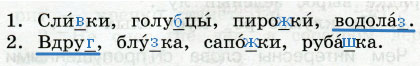 1. Сли́_ки, голу_цы́, пиро_ки́, водола́_.