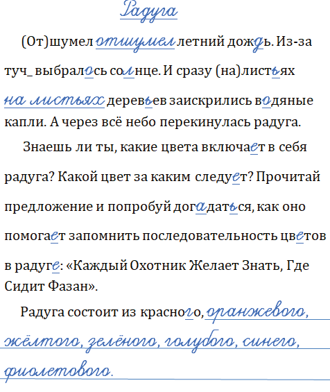 Знаешь ли ты, какие цвета включа_т в себя радуга? Какой цвет за каким следу_т? Прочитай предложение и попробуй дог_дат_ся, как оно помога_т запомнить последовательность цв_тов в радуг_: «Каждый Охотник Желает Знать, Где Сидит Фазан».