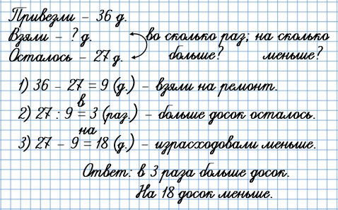 4. Привезли 36 досок. Когда несколько досок взяли на ремонт сарая, осталось 27 досок. Во сколько раз больше осталось досок, чем израсходовали? На сколько меньше досок израсходовали, чем осталось?