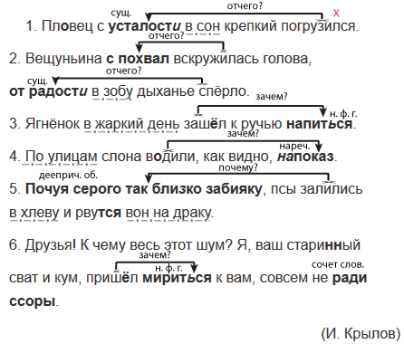 1. Пл..вец с усталост.. в сон крепкий погрузился. 2. Вещуньина с похвал вскружилась голова, от радост.. в зобу дыханье спёрло. 3. Ягнёнок в жаркий день заш..л к ручью напит(?)ся. 4. По улицам слона в..дили, как видно, (на)показ. 5. Почуя серого так бли..ко забияку, псы залились в хлеву и рвут(?)ся вон на драку. 6. Друзья! К чему весь этот шум? Я, ваш стари(н, нн)ый сват и кум, приш..л мирит(?)ся к вам, совсем не ради ссоры.