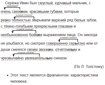 Прочитайте. Найдите определения и обстоятельства, которые указывают на усиление степени проявления признака. Задайте к этим обстоятельствам вопрос. Спишите. Можно ли сказать, что этот текст - фрагмент характеристики?