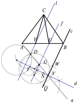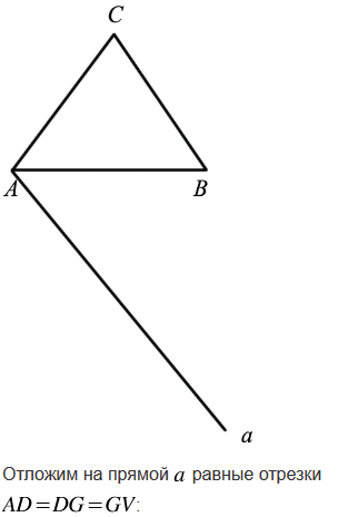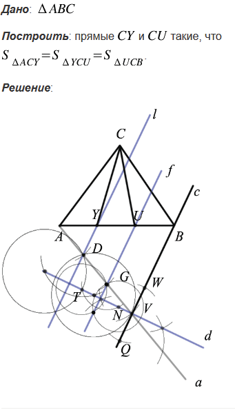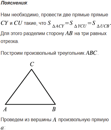Начертите треугольник АВС. Через вершину А проведите две прямые так, чтобы они разделили этот треугольник на три треугольника, имеющие равные площади.