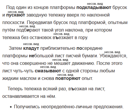 Затем (класть) приблизительно (по)середине платформы (небольшой лист писчей бумаги. Убеждаются, что она совершенно не мешает движению. После этого лист чуть-чуть3 (смазывать) с одной стороны любым жидким маслом и снова (повторить) опыт.