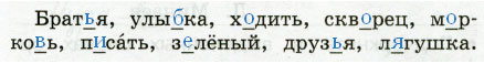 Слова можно объединить в три группы: слова с разделительным мягким знаком (братья, друзья); слова с безударным гласным в корне слова (ходить, скворец, писать, зелёный, лягушка); слова со звонкими-глухими согласными, стоящими в слабой позиции в корне слова (улыбка, морковь).