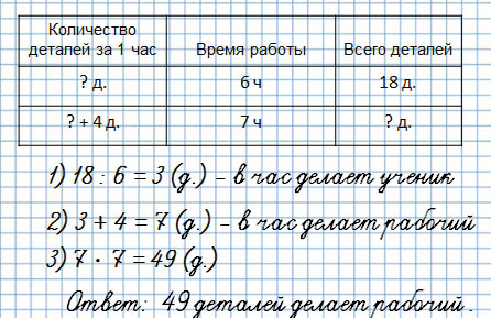 12. За 6 ч работы ученик изготовил 18 деталей, поровну за каждый час. Сколько деталей изготовит за 7 ч опытный рабочий, если за 1 ч он делает на 4 детали больше, чем ученик?