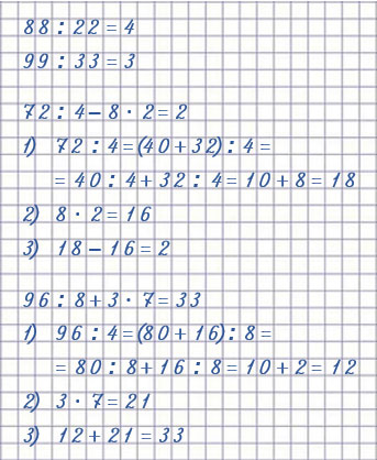 | 99 : 33 | 96 : 8 + 3 • 7 | 44 : (36 + 8) |