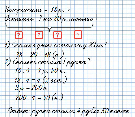 39. Когда Юля купила книгу за 38 р., у неё осталось на 20 р. меньше, чем стоила книга. На все оставшиеся деньги Юля купила 4 одинаковые по цене ручки. Сколько стоила ручка?