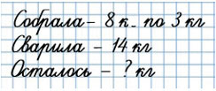 3. Мама собрала 8 корзинок вишни, по 3 кг в каждой корзинке. Из 14 кг она сварила варенье. Сколько килограммов вишни осталось?