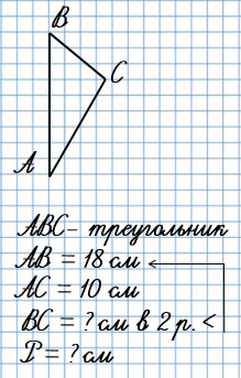 3) Длина первой стороны треугольника 18 см, второй - 10 см, а длина третьей стороны в 2 раза меньше первой. Найди периметр этого треугольника.