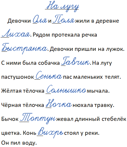 Девочки ___ и ___ жили в деревне ___. Рядом протекала речка ___. Девочки пришли на лужок. С ними была собачка ___. На лугу пастушонок ___ пас маленьких телят. Жёлтая тёлочка ___ мычала. Чёрная тёлочка ___ нюхала травку. Бычок ___ жевал длинный стебелёк цветка. Конь ___ стоял у реки. Он пил воду.