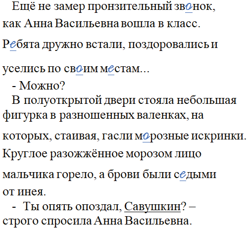 Ещё не замер пронзительный зв_нок, как Анна Васильевна вошла в класс. Р_бята дружно встали, поздоровались и уселись по св__им м_стам...