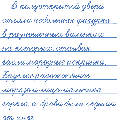 В полуоткрытой двери стояла небольшая фигурка в разношенных валенках, на которых, стаивая, гасли морозные искринки. Круглое разожжённое морозом лицо мальчика горело, а брови были седыми (сед) от инея.