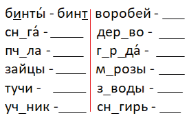 бинты́ — бинт снега́ — снег пчела́ — пчёлы за́йцы — за́яц ту́чи — ту́ча учени́к — ученики́ |