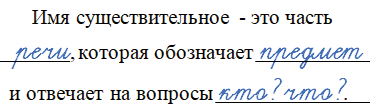 Имя существительное - это часть ___, которая обозначает ___ и отвечает на вопросы ___.